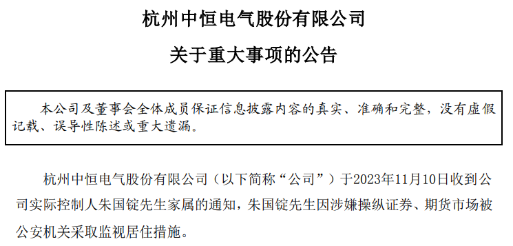 11月10日晚,中恒电气公告,公司实际控制人朱国锭因涉嫌操纵证券、期货市场被公安机关采取监视居住措施。